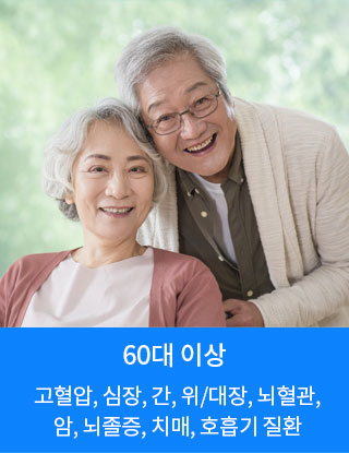 60대는 우리나라 3대 질환(암, 심장 질환, 뇌혈관) 사망률이 가장 높은 연령대일 뿐만 아니라 치매 및 호흡기질환도 유의 및 관리가 필요한 시기 입니다.